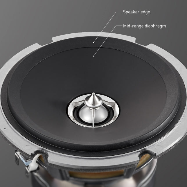 The diaphragm of the mid-range unit, which is part of the coaxial speaker unit, has a shallow shape with a smooth edge to reduce sound reflections so that the disturbance to the sounds radiated from the diaphragm is minimized, resulting in excellent frequency response, phase characteristic and wide directivity.