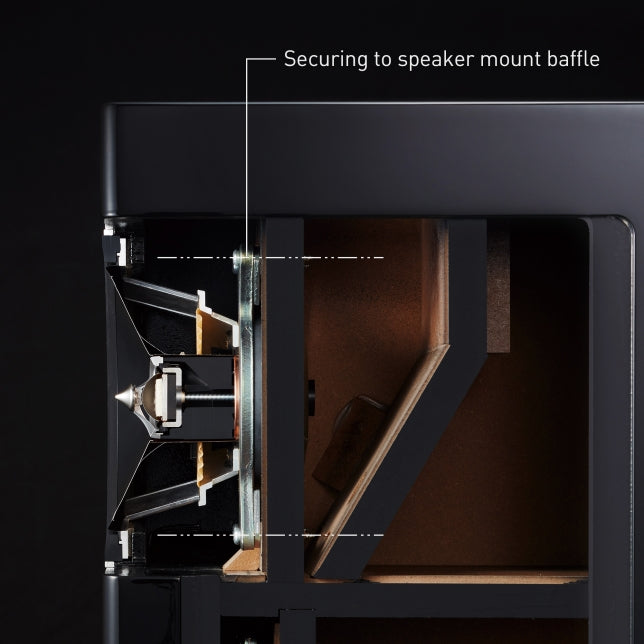 Unwanted vibrations generated by the speaker mount baffle have been further reduced by improving the vent holes using CAE and by allowing the one-piece woofer amount baffle to penetrate the bottom board for achieving higher rigidity. What’s more, the optimized vent holes improve the distribution of sound radiated from the back sides of speakers for enhanced response. In addition, the coaxial speaker mount baffle is separated from the woofer mount baffle to eliminate the mutual interference.