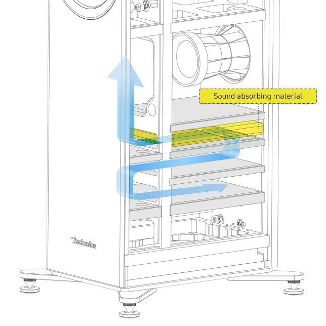 As a countermeasure, a sound path structure is provided at the bottom of the woofer cabinet to guide the standing waves. As a countermeasure, a sound path structure is provided at the bottom of the woofer cabinet to guide the standing waves. Sound absorbing material is installed at the location in the sound path where the speed of sound becomes fastest. This enables the efficient removal of standing waves, which are the cause of resonance peaks, with a minimum amount of sound absorbing material. (Patented)